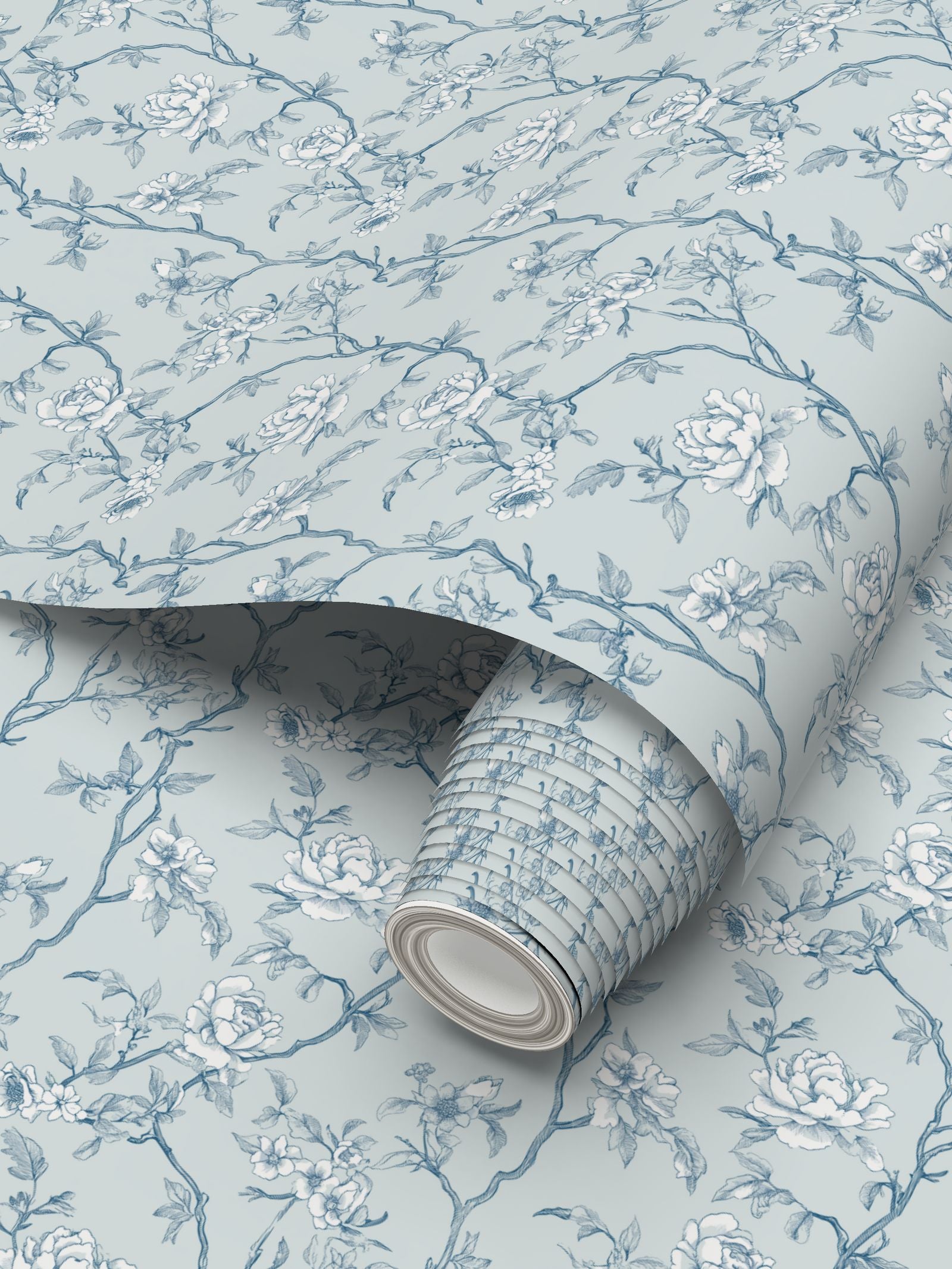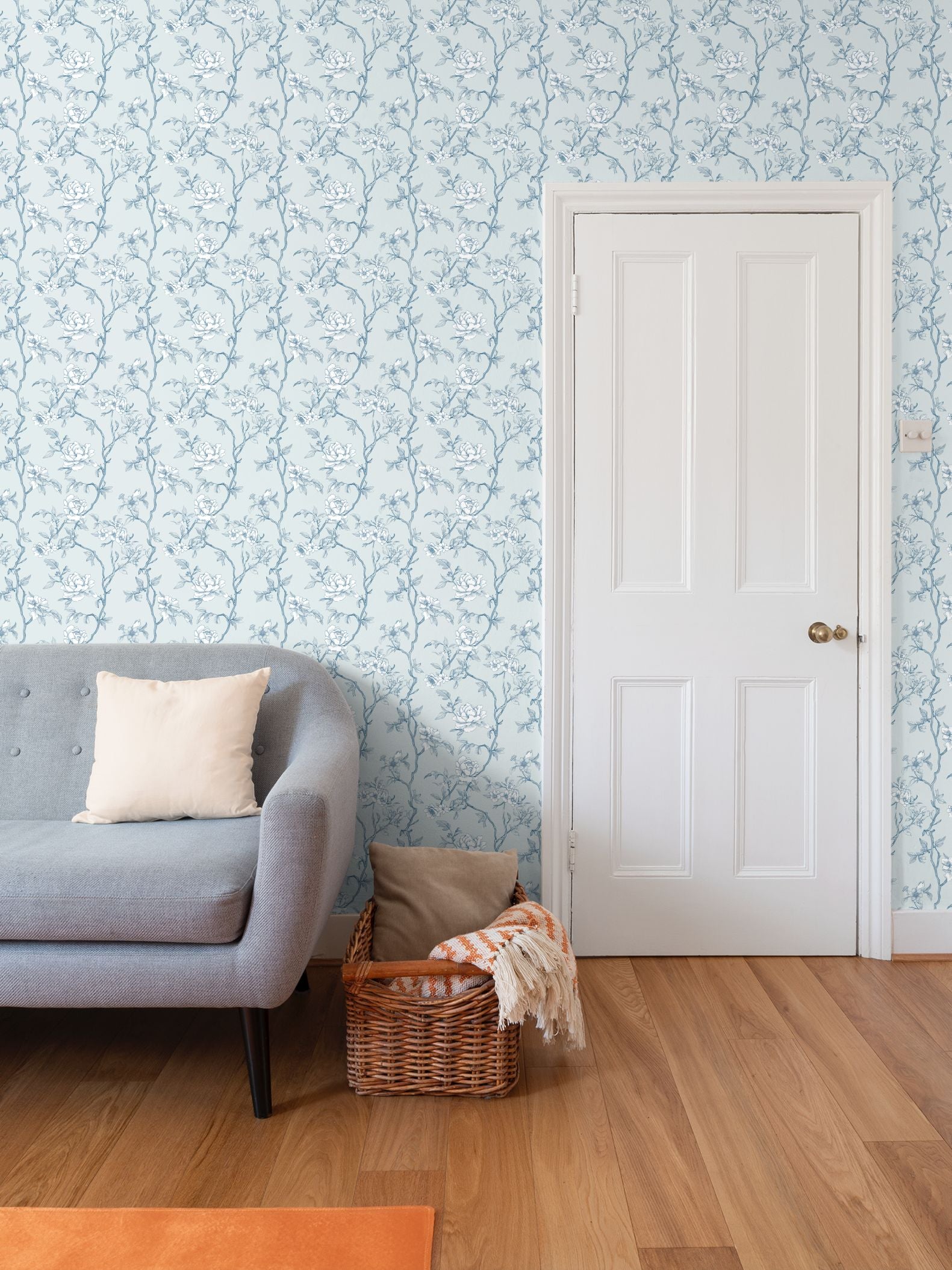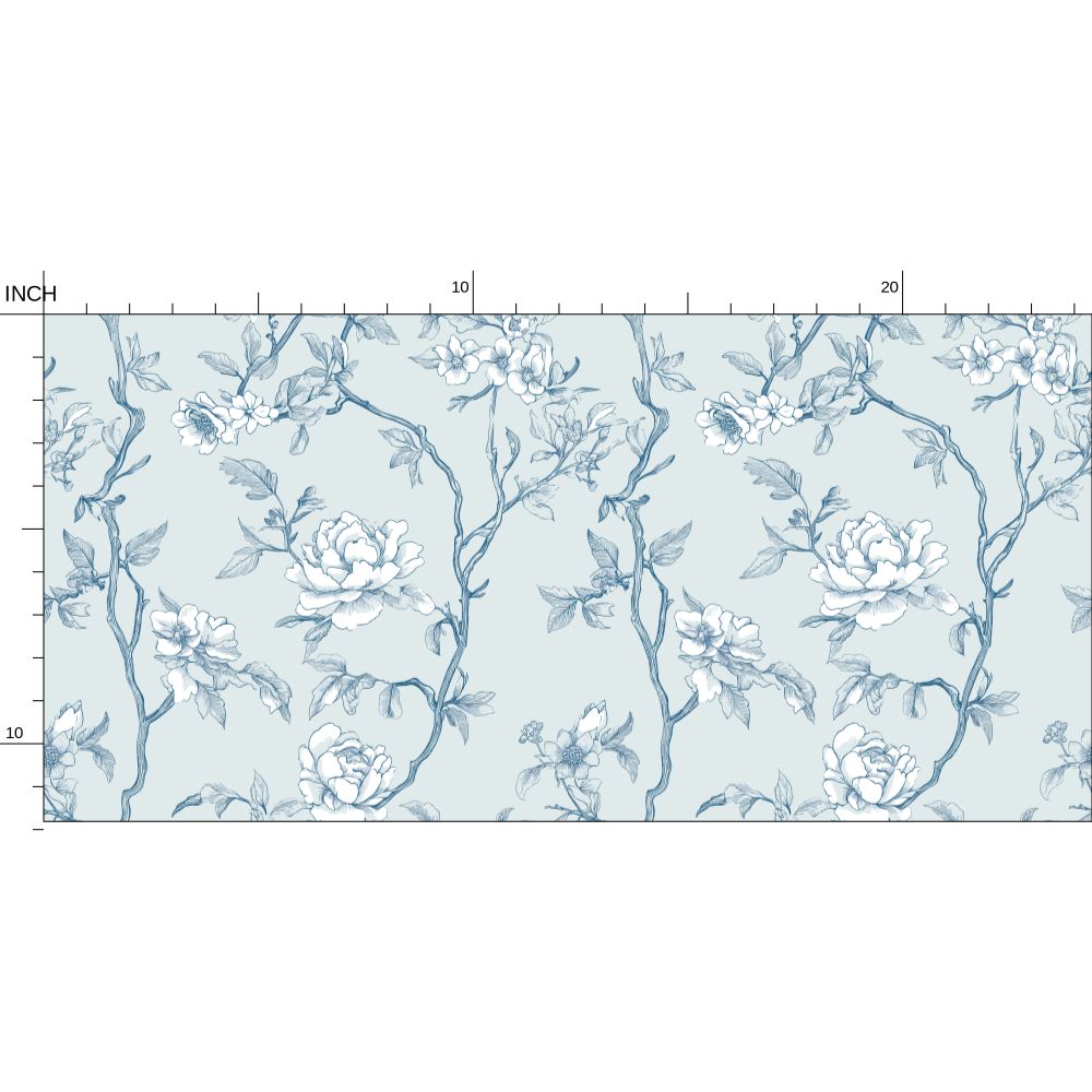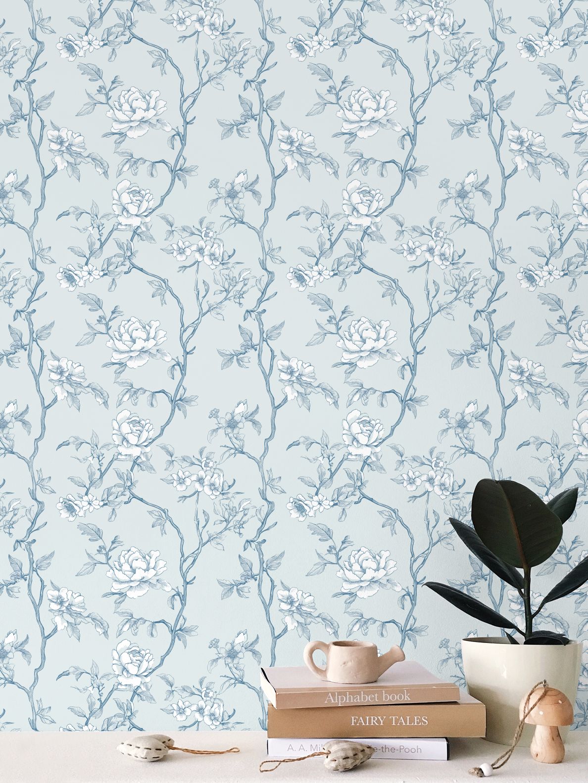 A floral chinoiserie pattern with delicate white flowers on vining branches
