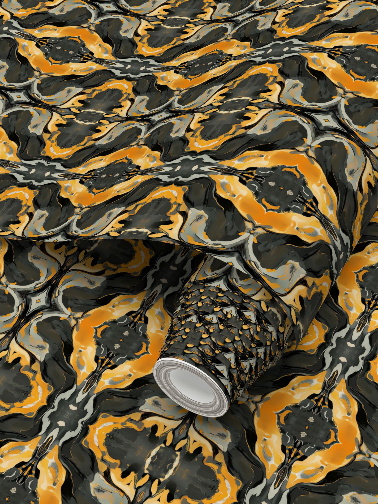 A floral damask motif with an abstract, melted look featuring grays and yellows