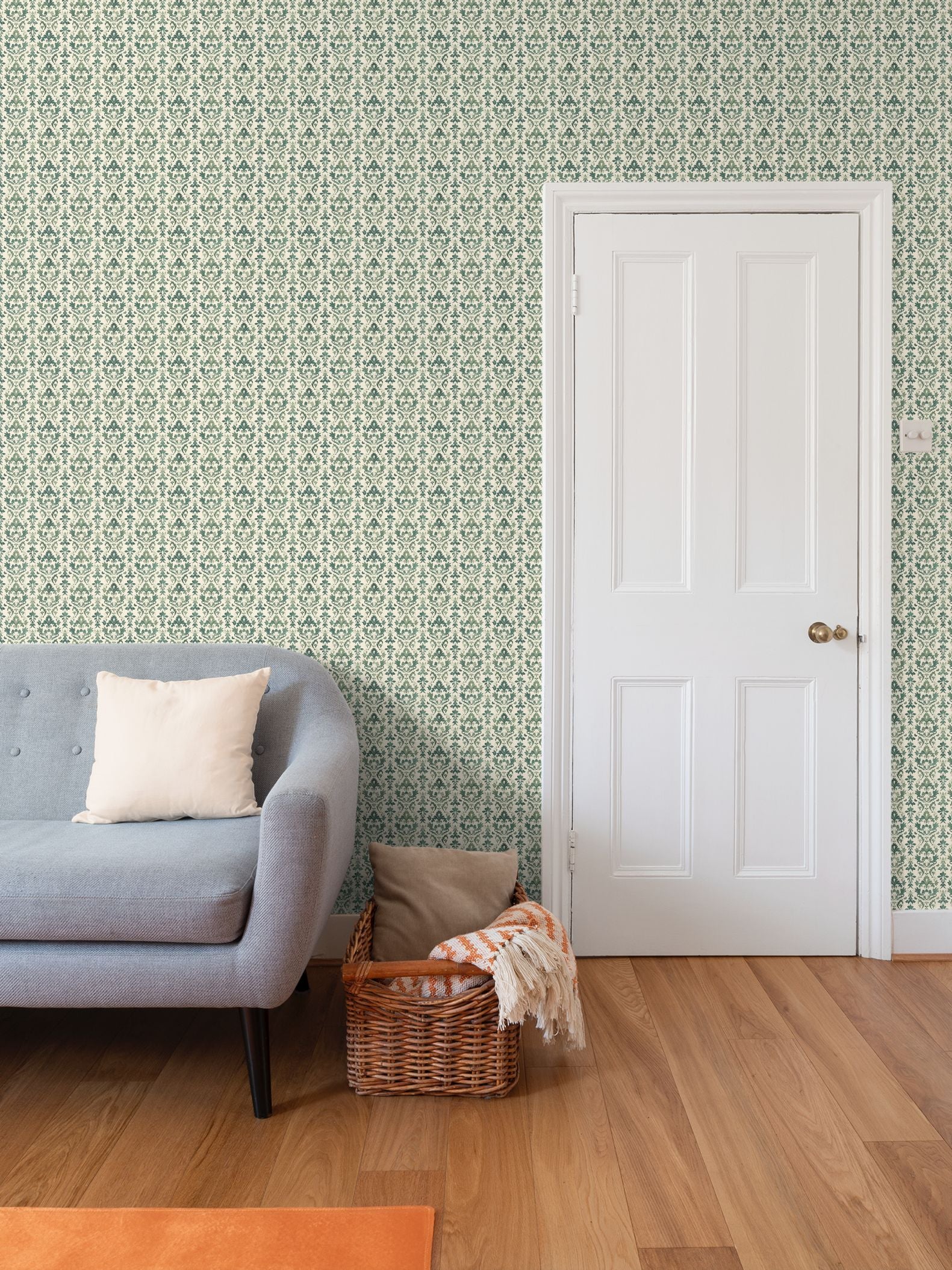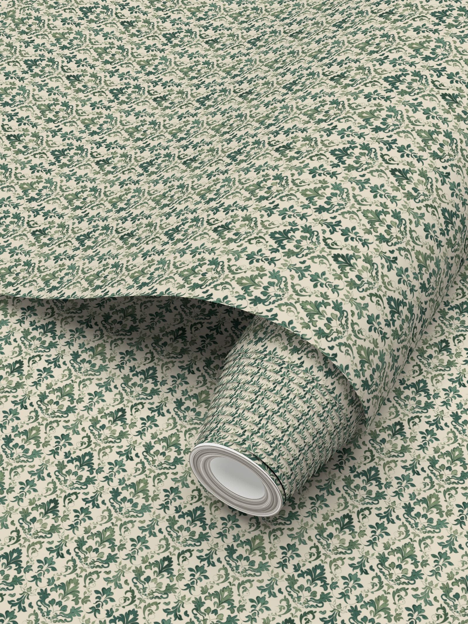 This luxe green damask wallpaper features a seamless 6 inch repeat pattern.